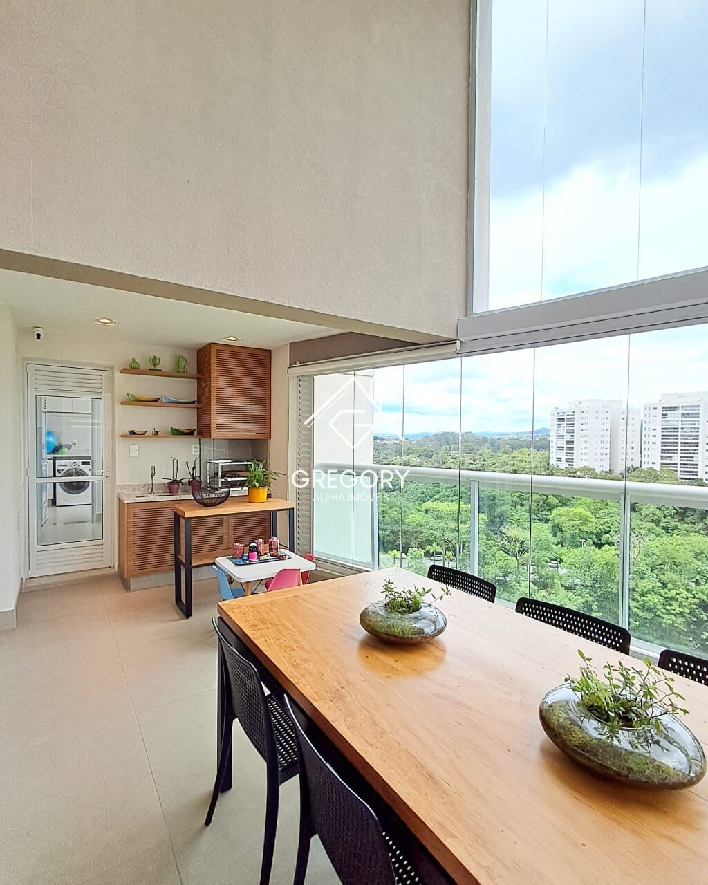 Lindo Apartamento em Alphaville, mobiliado e decorado, com área útil de 328 m², 4 suítes sendo a do casal com closet, living amplo para vários ambientes, pé-direito duplo, escritório privativo, adega, sala de TV, sala de jantar, cozinha planejada com sala de almoço, área gourmet com pé-direito duplo e churrasqueira, varandas fechadas com vidro.