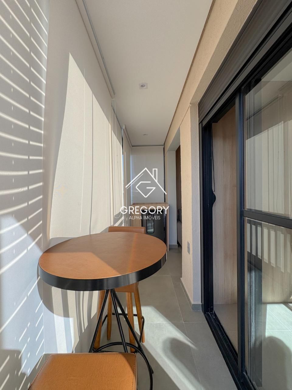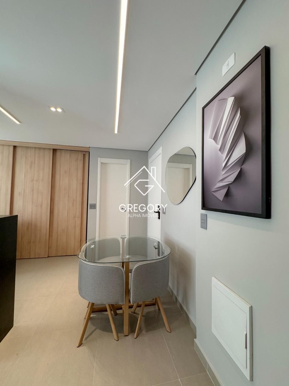A cozinha é completa, equipada com cooktop, forno, geladeira e micro-ondas, oferecendo praticidade e funcionalidade. O banheiro possui acabamento refinado, agregando elegância ao ambiente. O imóvel também dispõe de ar-condicionado e 01 vaga de garagem coberta.