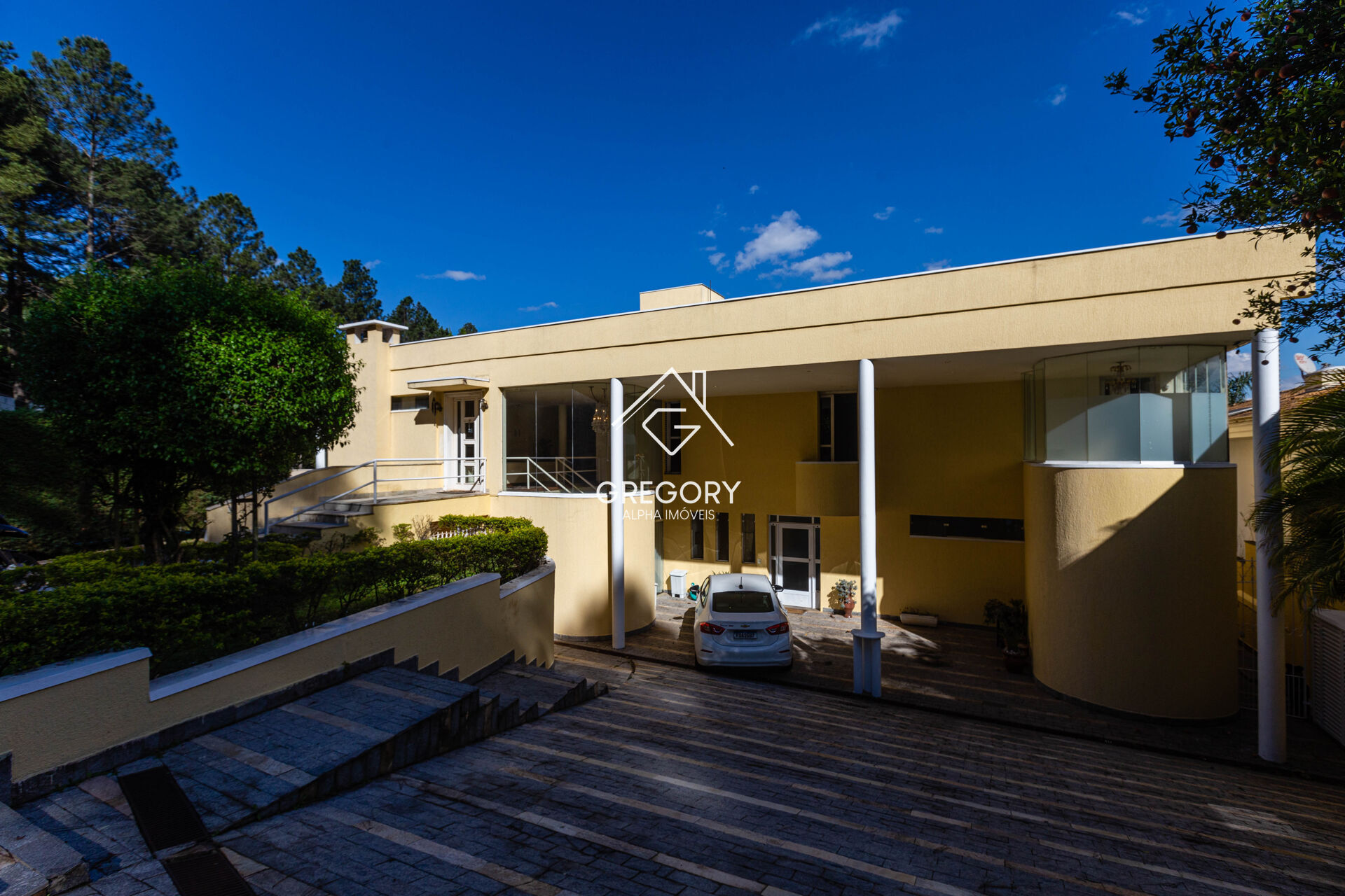 A área íntima conta com quatro suítes, incluindo uma suíte master com dois closets e varanda panorâmica, além de sala de TV com terraço, espaço versátil para escritório ou ateliê e garagem para até oito veículos. A área social possui living amplo com três ambientes, sala de jantar, cozinha reformada com padrão Florence, espaço gourmet com churrasqueira e varanda com vista definitiva de Alphaville.