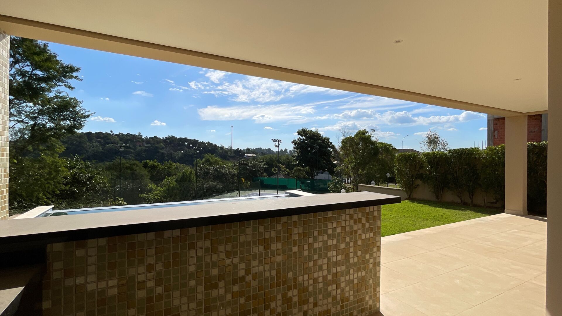 e próxima à quadra de tênis do condomínio com uma vista para o pôr do sol.