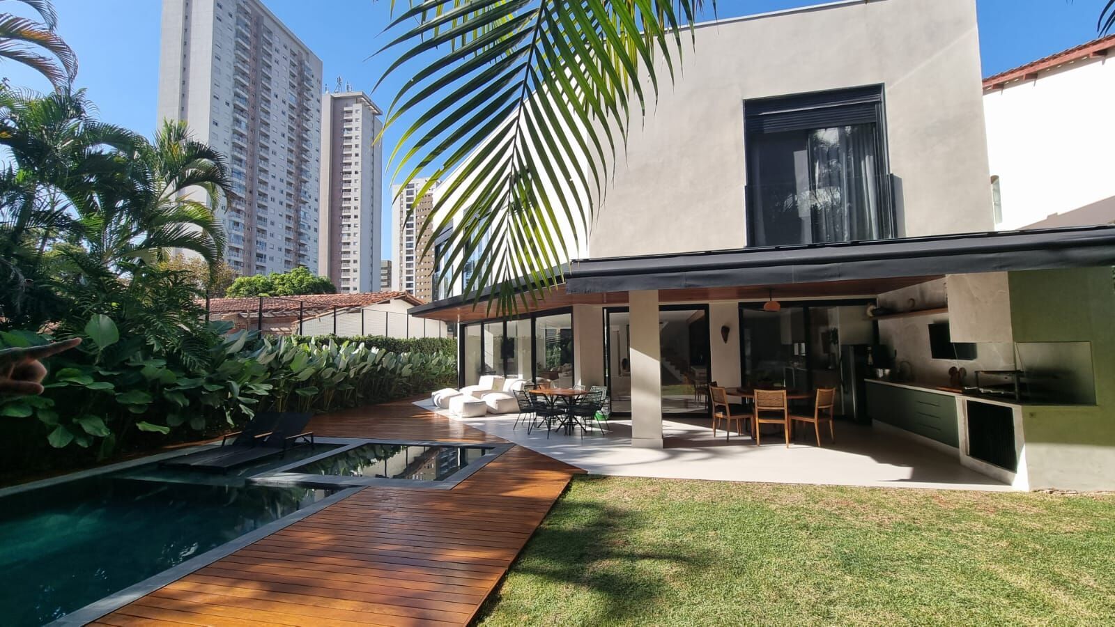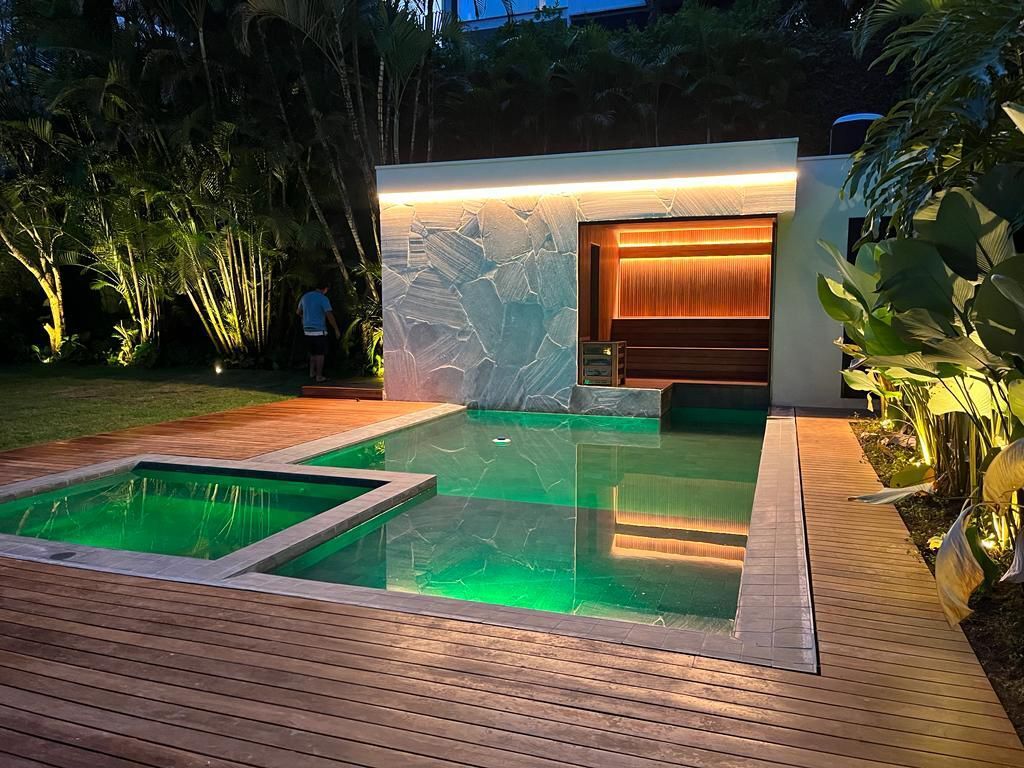 ampla área de lazer com piscina, sauna integrada a piscina