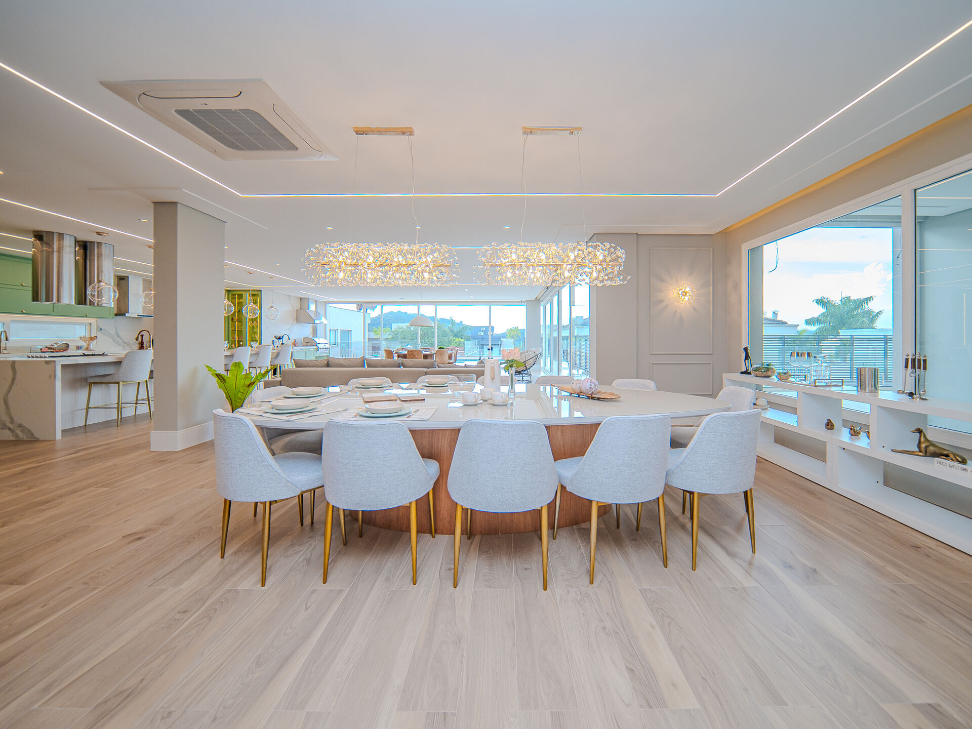 A cozinha, um verdadeiro espetáculo de design contemporâneo, apresenta uma ampla bancada para oito pessoas,