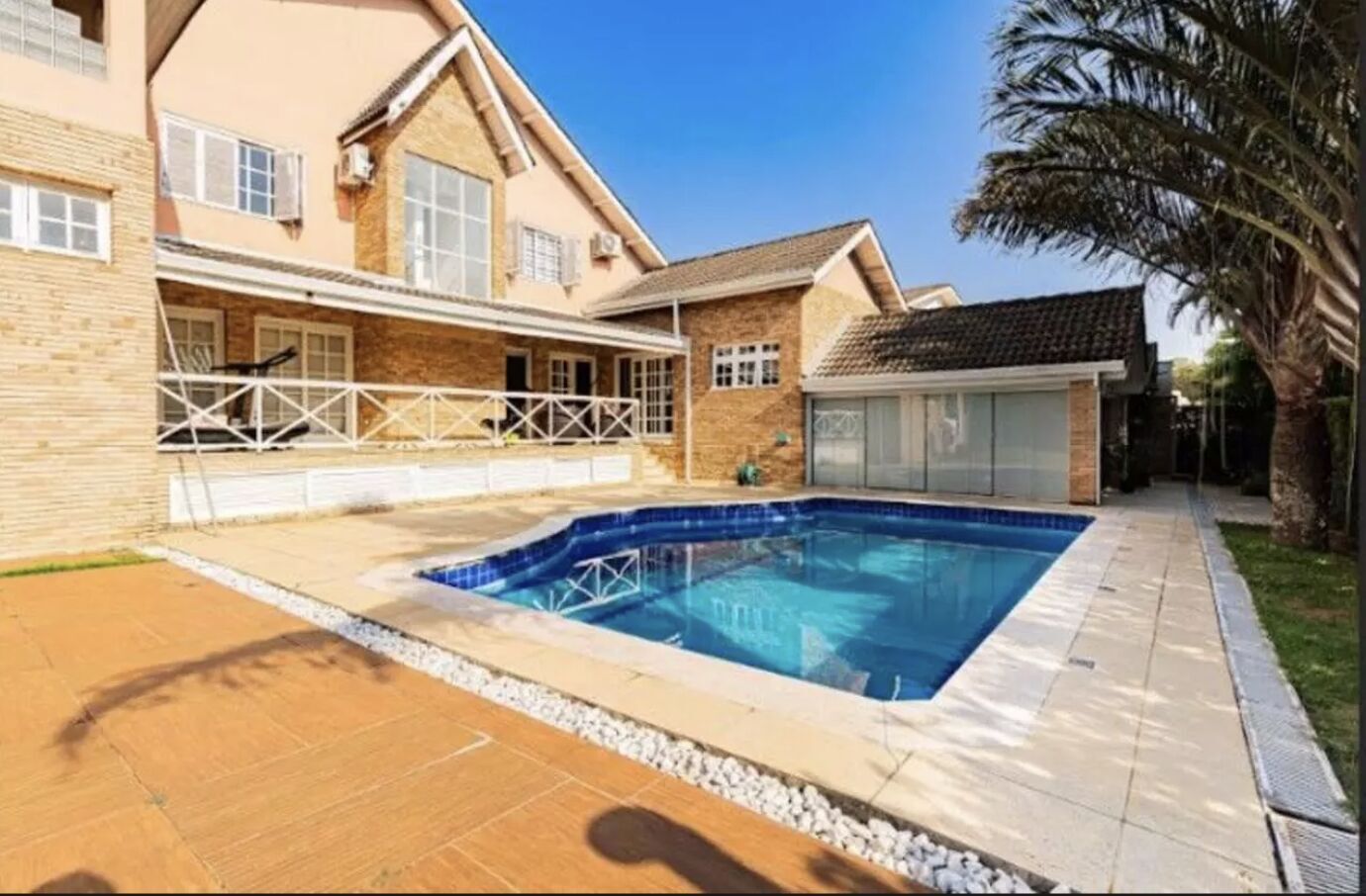Área externa com gramado e piscina