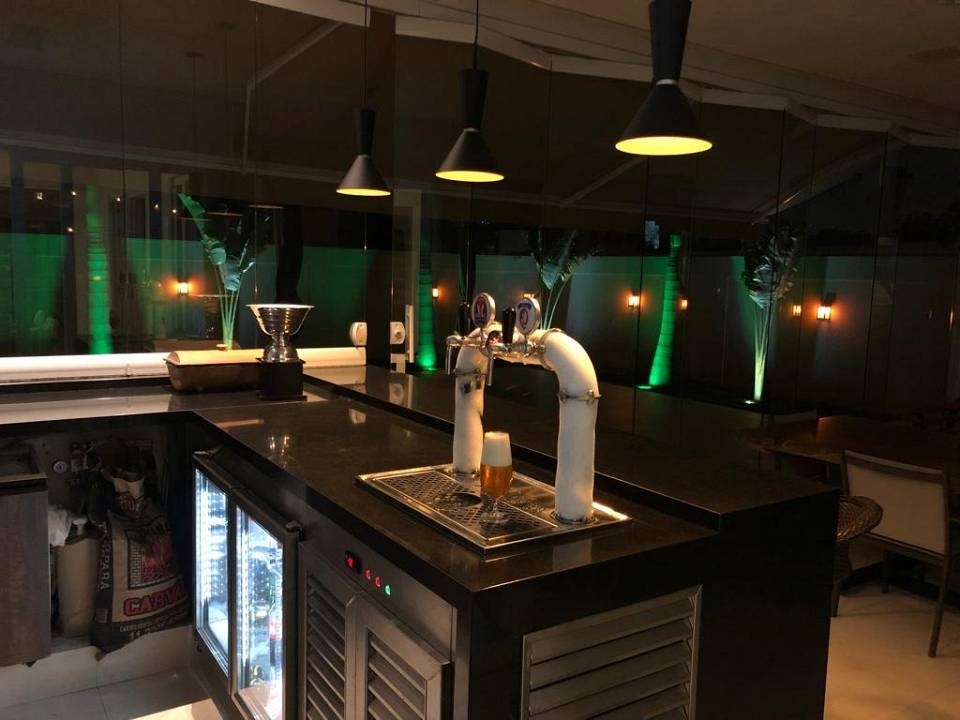 Área de lazer varanda fechada com abertura total em vidro, churrasqueira e choppeira trave com 2 bicos e balcão refrigerado para 2 barril de 50L e cervejeira, e toldo retrátil elétrico.
