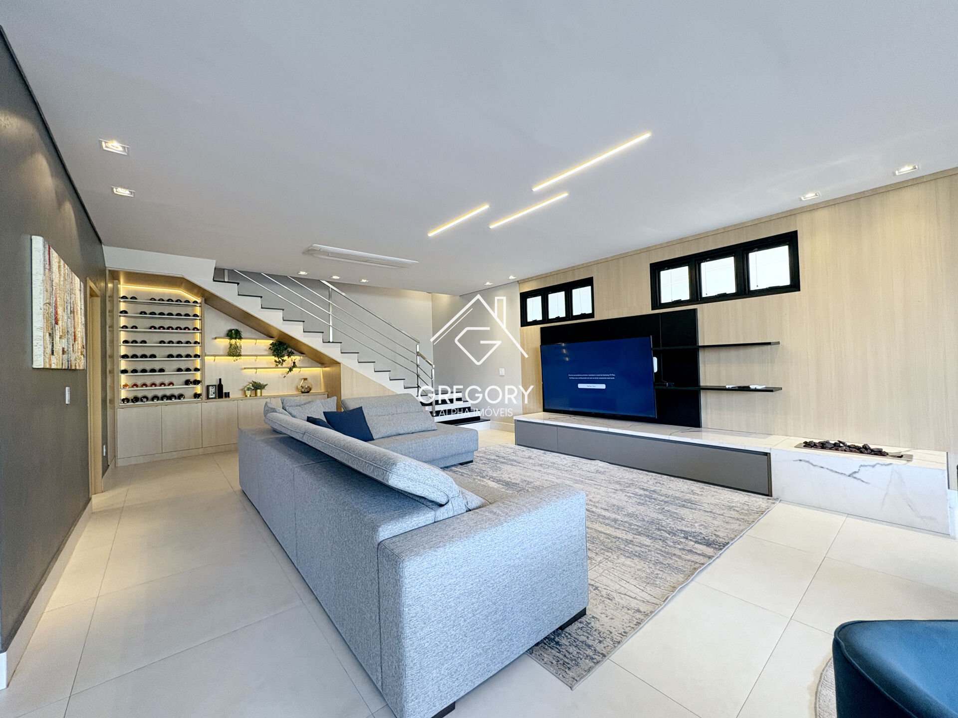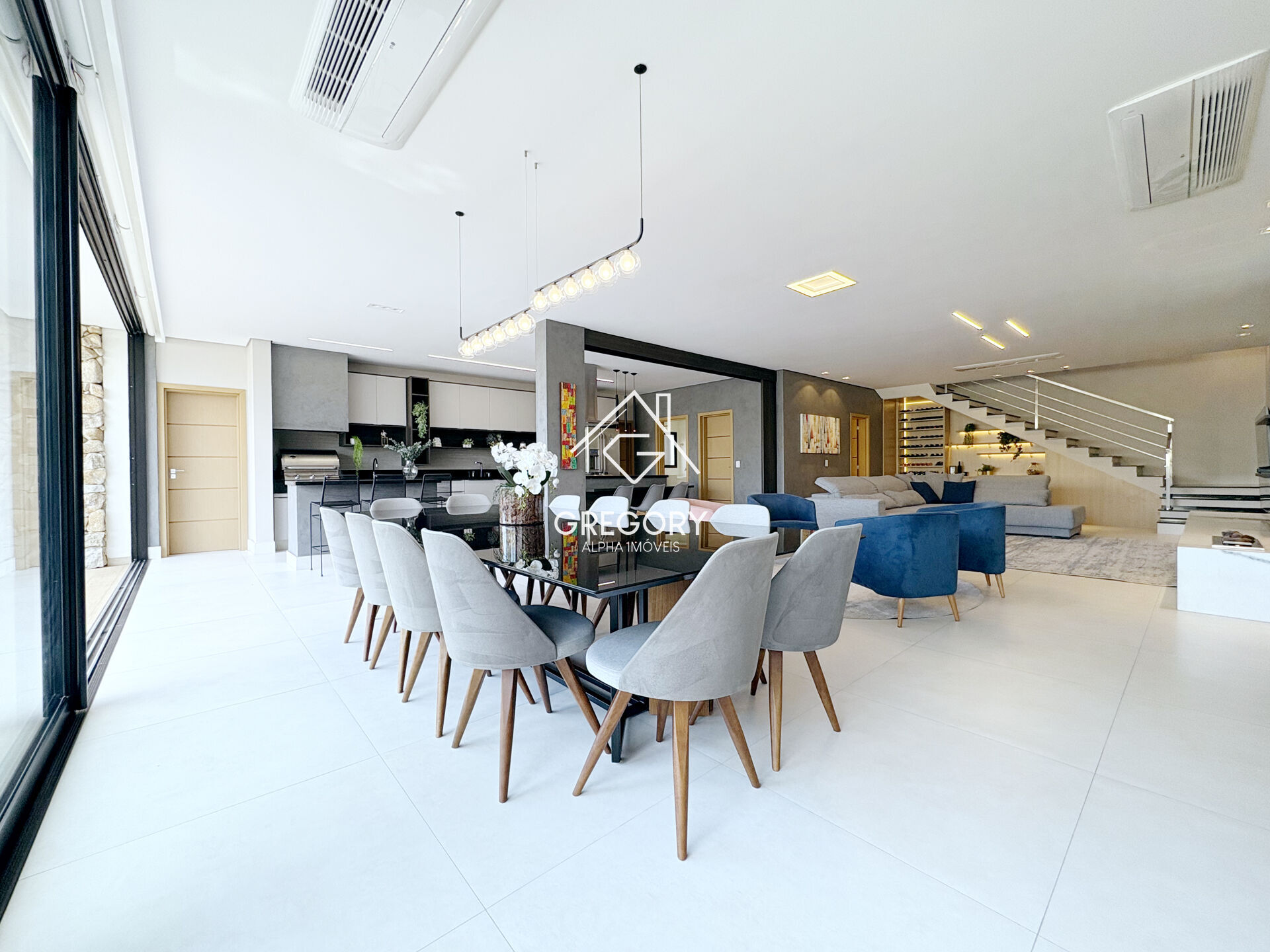 - Amplo living com 3 salas: jantar com mesa para 12 pessoas, sala de estar (4 poltronas), e sala TV ampla (tela de 82”);