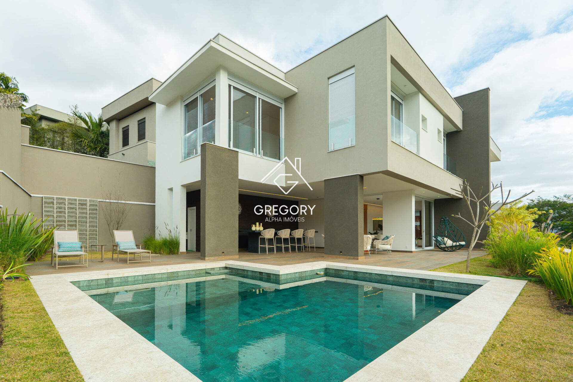 A casa conta com 4 suítes com closets individuais, pé-direito alto que valoriza a iluminação natural, salas de estar, jantar e TV, lavabo e cozinha planejada. O imóvel é mobiliado com excelente padrão de acabamentos e possui acesso por biometria e fechadura digital.