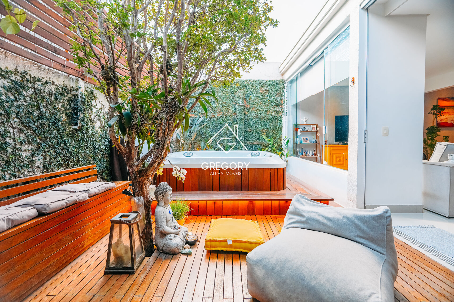 O espaço externo conta com quintal, deck e pergolado, além de um spa privativo com capacidade para até 8 pessoas, perfeito para momentos de relaxamento. O imóvel dispõe ainda de lavabo decorado, suíte de funcionário e lavanderia coberta.
