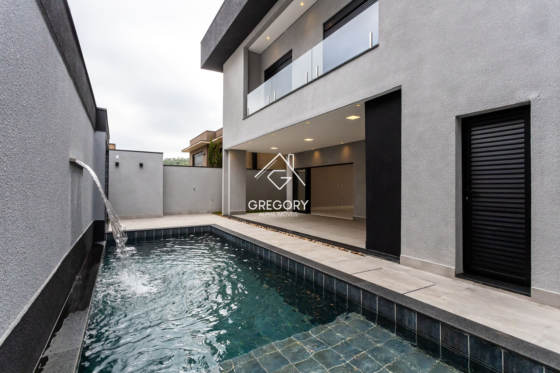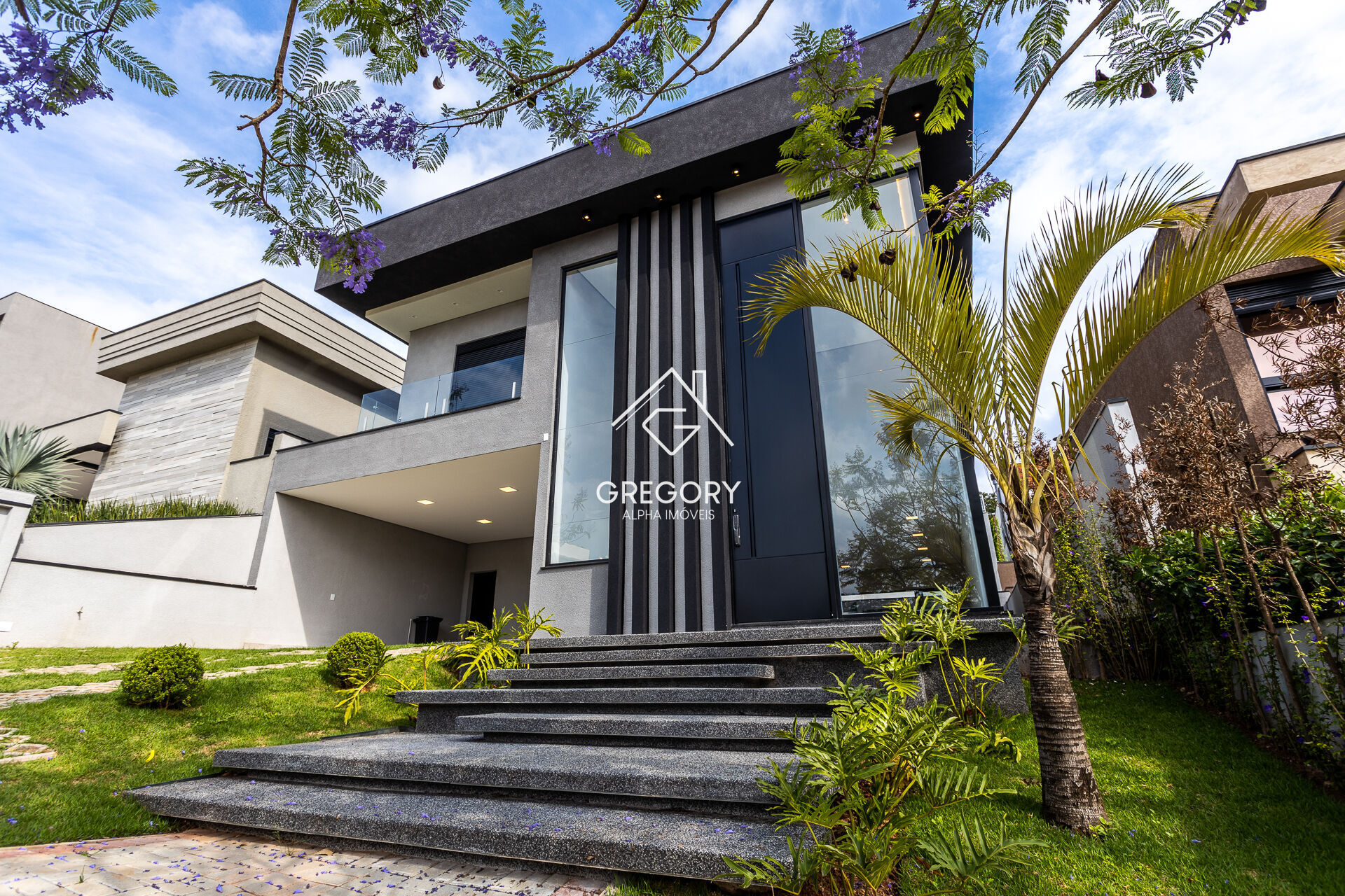 AT: 420m² / AC: 392m² Sobrado: 05 Suítes sendo uma master com closet e sala de banho com hidro. No pavimento térreo o hall de entrada, salas de Estar e Jantar são integradas com Cozinha Americana com ilha quente e espaço gourmet. Um lavabo e um banheiro completo para atender o espaço de lazer externo. Piscina com prainha integrada com Sauna a vapor (Úmida). Casa 100% iluminada em LED (áreas internas e externas). Garagem para 04 carros (02 cobertos); Lavanderia coberta; Despensa; Corredores laterais e Amplo quintal. ACABAMENTO: Porta de entrada imponente e pivotante com 6 metros de altura equipada com fechadura eletrônica e revestida em ACM. Porta de entrada da garagem pivotante com fechadura eletrônica e revestida em alumínio e vidro; Revestimento em madeira maciça (cumaru) no pavimento superior; Todos os pisos internos e externo são em Porcelanato da marca Elizabeth Revestimentos. A dimensão dos porcelanatos das salas, cozinha e área gourmet são de 1,20x1,20.