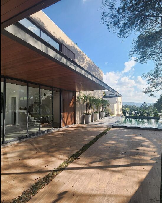 piso da área social com porcelanato de grande formato, piso superior revestido em madeira cumaru. Forro em madeira ripada cumaru.
