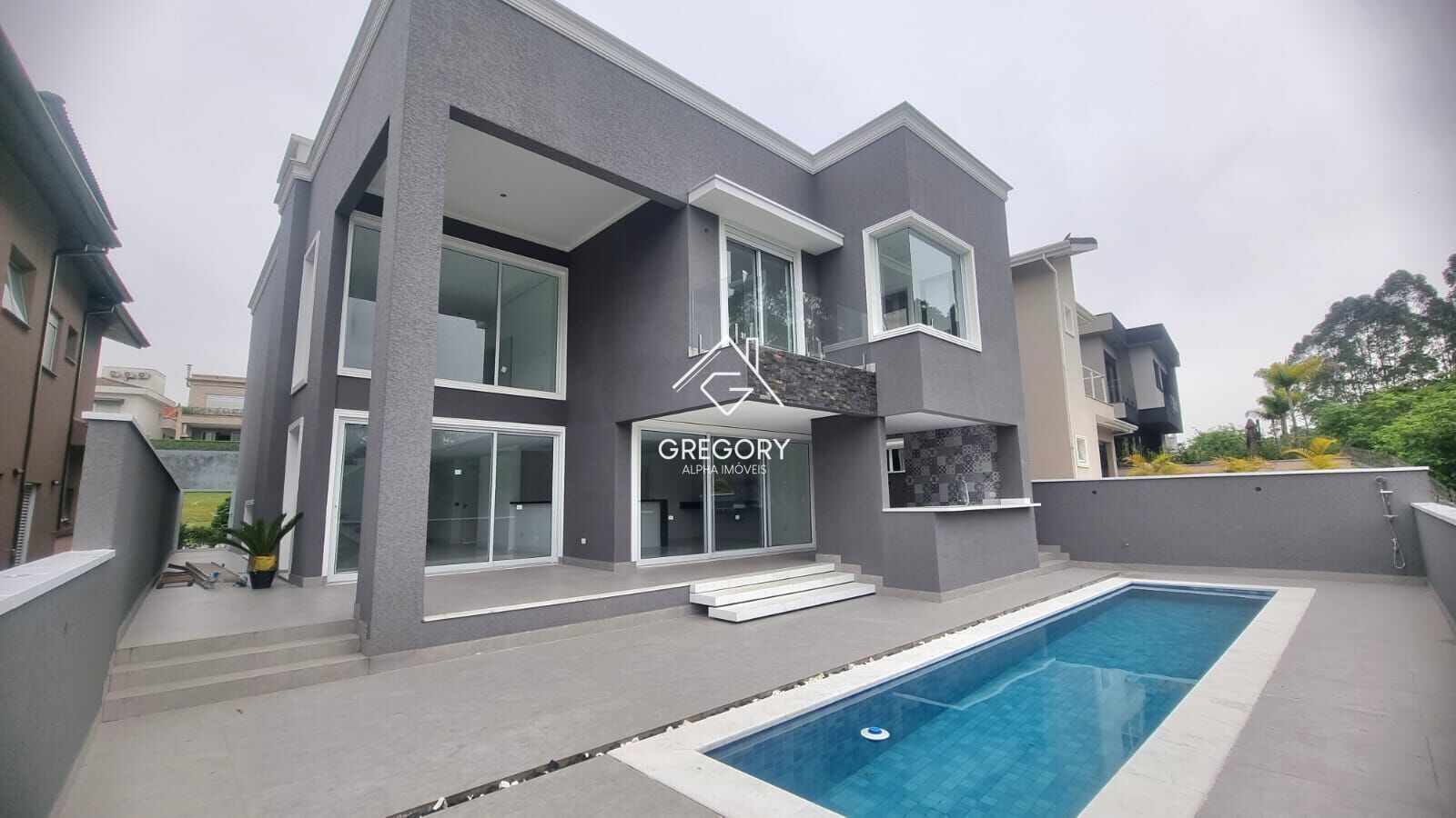 Living com pé direito duplo com lareira e três ambientes, escritório, lavabo. Cozinha ampla integrada com ilha, bancas de mármore, despensa, área de serviço com dormitório de colaboradora.