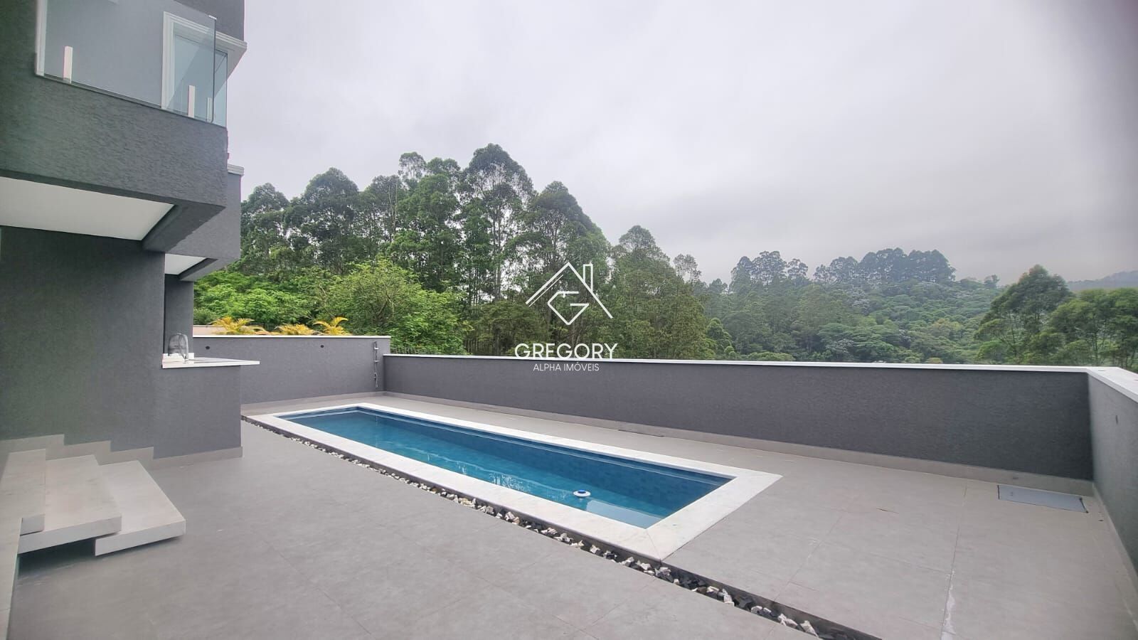 Espaço gourmet. Piscina com iluminação e banho de apoio.