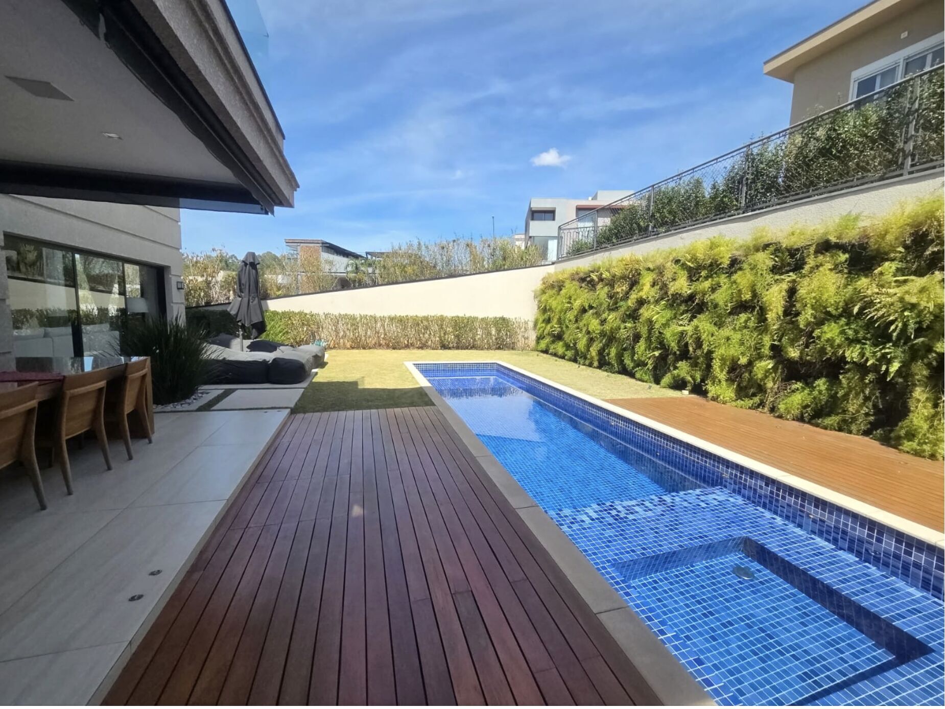 Área gourmet integrada à piscina com churrasqueira e forno de pizza